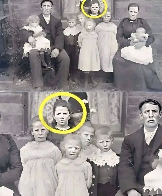 As the software refined the background, a pale female face began to emerge between the children and the wall behind them. Her expression was stark, her eyes unnervingly intense, and her features far too detailed to be explained away as damage, shadow, or photographic artifact. She appeared to be standing directly behind the children, her gaze fixed straight ahead. Yet original records listed only five family members present that day.
